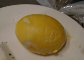 左側が剥いた状態。右側が断面。 江戸時代の作り方と違って頭頂部に穴は開いていないようでした。殻がもろいような感じになっていたので、そこら辺に製造のヒントがあるのでしょうか?