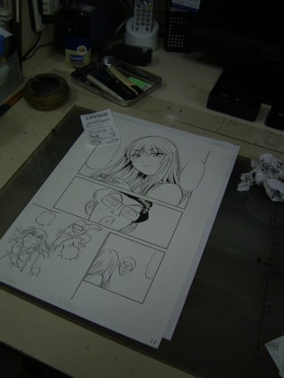 主のいない机の上。ペン入れ途中の原稿。 私はソファーでお休み。