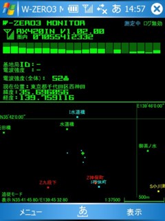 左は”W−ZERO3MONITOR”。基地局の情報と基地局間の電界強度から、おおよその現在位置を表示するソフト。郵便番号情報から地名を表示してくれるのと、主要駅の座標を表示できるので、大まかな位置把握が可能。