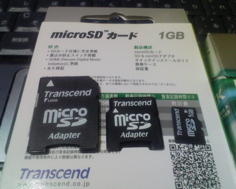W−ZERO3用に1GバイトのSDメモリーも購入。本来はminiSDを使うのだが、なんだか流通が減っていて、ノーマルSDやmicroSDしか店頭になかったり、たまにminiSDがあっても妙に値段が高い。結局TranscendのmicroSD1Gバイトを実家近くのナガシマというお店で2480円で購入。 6年前に仕事で初期のSDカードがらみの仕事をやった際は、まだ64M程度だったように記憶している。6年で容量は32倍程度、容積は6分の1に低下。値段に関しては50分の1位か? 一度、microSD→miniSDカードアダプタ→SDカードアダプタ→CFカードアダプタ→PCMCIAタイプ2アダプタと4段階アダプタ重ねというのをやってみたい。理屈では認識するはずだけれども、本当に認識するかな(^^;