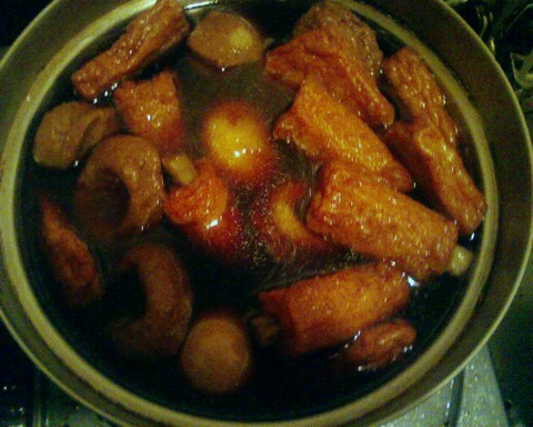 上記のおでんの素を900ccの水で薄めて具材を煮込む。鍋の底なんか絶対に見えないこの黒いスープが静岡おでんの特徴。いかにも醤油がたっぷりでしょっぱそうな色に見えるけど、この色は牛すじのダシの色が主体なので、別にしょっぱいと云うことはない。
