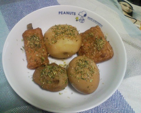 2〜3時間ほど沸騰しないようにごくごく弱火で煮込む。具材はゴボウ巻き、薩摩揚げ、卵、ジャガイモと残念ながら定番の黒はんぺんが入手できなかったので代用品のつみれ。他に牛すじや白モツやコンニャクなどがよく合う。 個人的には丸一日煮込んだくらいの真っ黒く染まっているくらいが好み(^^;。場合によっては味噌(赤みそが主体)をつけて食べます。味噌に関しては静岡でも場所によって使ったり使わなかったりします。振りかけてあるのはスープに標準添付されていたサバ節と青のり粉。これは標準で使います。 今まで静岡おでんのおでん缶やレトルトなどを試していたが、どれもいまいちだった。しかしこの静岡おでんの素は、かなり店の味を再現できていて、家庭で静岡おでんを楽しむには最適だと思う。 今度帰省したら、買い込んでおかなきゃ(^_^)。