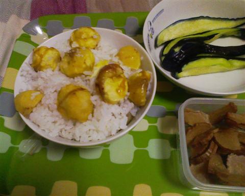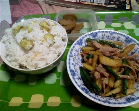 まあ、こんなもんこんなもん。ちなみに右のおかずは、豚肉とジャガイモとインゲンの炒め物。