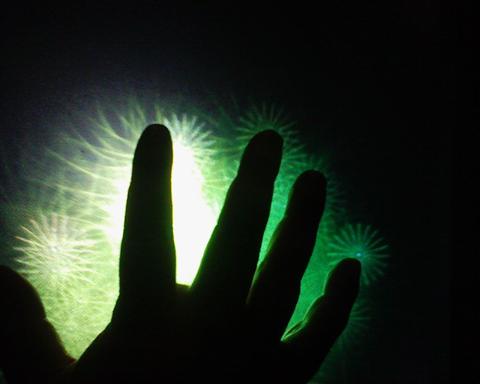 これがインタラクティブ物。タイトルは「残像」。スクリーンの背後から赤外線で撮影し、手や物体の位置を検出してプロジェクタの画像に反映させる仕組み。手をかざすとキルリアン放射みたいに光がうごめいてとても気持ちよい。 これは友人とは無関係なのだが、もう一つとても面白い展示があった。あとでネットで探せばいいやと思って、無理に画像は撮ってこなかったのだけど、今調べてみたら、ちょっと出てこない。 10月15日追記 |