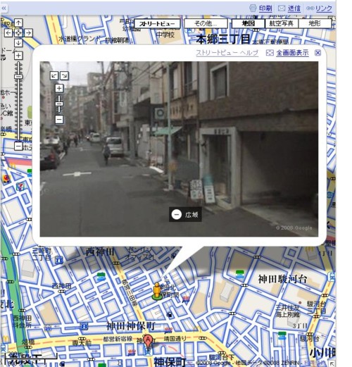 かねてからプライバシーの侵害だとかなんだとかで有名だったgoogleマップのストリートビュー機能が日本でも使えるようになりました。 東京23区内に関して云えば、クルマの通ることが出来る道はほぼすべて網羅しているような状態。 某古書店の入り口前の画像 便利とかすごいとか云う前に、なんだかちょっとイヤンな感じです。