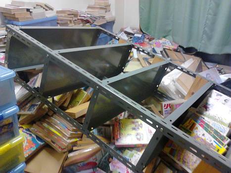 感圧(抵抗膜)式のタッチパネルで8インチ(800×600)液晶。CPUはCoretexA8系800MHz。RAM512MB、ROM(フラッシュ)4GB。バッテリーは3900mAhとまあまとも。思わず入札したら11,500円で落札しちゃいました。しかも専用のカバーケースと4GBのMicroSDカードとドロイド君マスコットのオマケ付き。 でまあこの話のどこが地震につながるかというと、これからこれから… 9日に落札して10日に支払い、到着予定は11日の14時〜16時となりました。わくわくしながらゆうパックの到着を待っていたのですが、到着は14時39分でした(荷物番号から荷物追跡サイトで確認)。 配達員から受け取ると早速梱包を開けて、電源投入。一瞬Androidマークが表示されるが、すぐに消灯。これは多分バッテリーが切れちゃってるんだろうなとACアダプターを接続して再度電源投入。あっさりと無事にAndroidが起動。さあて次にやるのは無線LANへの接続かなと、準備を始めたその瞬間… 14時46分突然の強い揺れ。店の棚が結構揺れる。ちょっと棚を押さえたほうが良いかなとか呑気なことを考えていると、だんだんと揺れが大きくなり、しかもなかなか収まらない。しばらくすると本が棚から飛び出し床に散乱を始める。へたに店を飛び出すとヤバい状況になり始めたので、棚の無い壁側に身体を貼り付け、第一波が収まるのを待ち続けた。揺れが小康状態になったところで、携帯電話と7分前に到着したばかりのAndroidタブレットを抱えて、店の外に出る。アスファルトの地面が余震でまだ揺れている。店のビルのとなりの木造2階屋の壁面が崩れている。静岡の実家と大田区に住む友人に一応安否の連絡を電話する。わたしの携帯はイーモバイルで友人はウィルコム。マイナー会社どうしの携帯だと、こんな災害時にも普通に通じるところが逆に凄い。ソフトバンクとかドコモを使っている友人には結局つながらず。 地震が収まったかなと思って店に戻ってもしばらくすると余震が発生し、また店の外に避難というのを何度か繰り返す。店内はもうどこから手をつけていいか分からにような散乱状態。 30分ほどしてから被害確認のためすぐそばの自宅件倉庫に戻る。倉庫の方は棚が転倒して部屋の中に入れない状態orz。簡単には手をつけられる状態ではないし、まだ余震が続いている状況なので、電気器具からの発火を防ぐためブレーカーを落とし、また店に戻る。 とりあえず店の方は机に辿りつける程度には通路を確保して、呆然と店内の状況を眺める。実のところ12,13日と2日かけて店の棚を増設しようと考えていたのだ。店の外に避難している真っ最中に実は注文した棚が届いたのだが、こんな状況なので申し訳ないが明日もう一度配送してくれと頼んで業者には引き揚げてもらった。 結局店では作業する気力にならず、コンビニで購入したスナック菓子で晩飯の代用とした後、自宅件倉庫に戻る。 部屋の中は高さ50cm位には本が積もっている状況(T_T)。全部で9台ある棚のうち5台が転倒している。部屋の手前の棚から起こす作業を20時ころに開始。転倒防止のために棚同士をボルトで連結していたが、逆にそれが災いしてボルトを抜かないと転倒した棚を起こせない。そのボルトを抜く作業が本の洪水の中難航する。2時間かけて一つ目の棚をようやく起こす。深夜0時になった時点で三つ目の棚を起こし、ようやく自分が座れるスペースを確保できた。