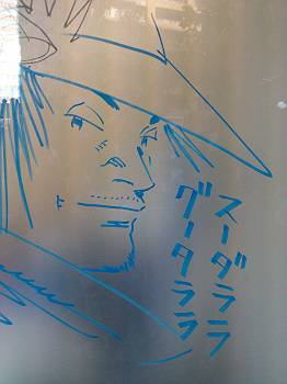 来月取り壊し予定の小学館本社ビルの窓ガラスに書かれた落書き。上は浦沢直樹の「20世紀少年」。 コミティア105にもちょっと行きました。