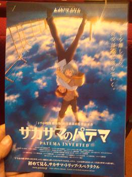 古本まつりをそっと抜け出し(^^ゞ、「サカサマのパテマ」の試写会に虎ノ門まで出かける。開場はニッショーホール。客席の落差がちょっと足らない上映場所なのでちょっと見にくい。 スタジオ六花の作品はわりかし好みなのでちょっと期待。 うー、映像は文句ないし、ストーリー展開も悪くないのだけれど、重力反重力という設定が常に付きまとうのでかなりややこしい。それぞれの体重はどうしたとか、空の上にあった廃墟の土台はどーなってるのとか、気圧はどうなってるのとか、あの惑星の構造はどうなってのとか、サカサマ人が普通の食事を続けていたら元に戻るんじゃないのとか、いちいち余計な考えが浮かんでストーリーに集中できない(^^ゞ。 設定が重要な映画なんだけど、その設定が鑑賞を阻害しているなぁ。