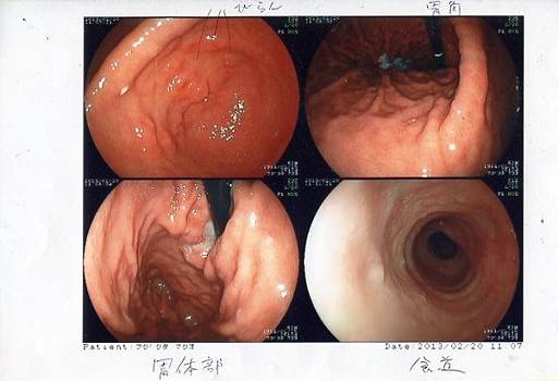 てなわけで胃カメラの画像。初めて自分の胃の中見たぞ(^^ゞ。左上の画像にびらんがあるらしいけど、素人にはよくわからんな―。 以前は胃潰瘍じゃないとピロリ菌の駆除薬は保険適用できなかったが、最近になって胃炎レベルでも保険適用が可能になったらしい。そんなわけでピロリ菌の駆除は行う予定。