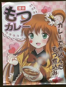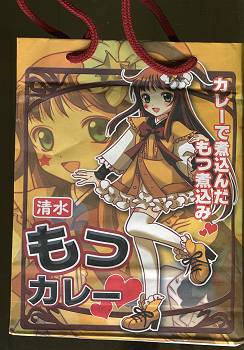 まあ何といいますか(;´Д`)いつの間にこんな事になっていたんだ。150g入りレトルトパウチのもつカレーです。ちょっと絡めの味付で酒のツマミにもご飯にかけても良い感じの味付けですが、レトルトカレーと考えるとちょっと量は少なめ。 清水もつカレーの百都かれんちゃんだそうです。(;´Д`)。キャラのデザインはこの方。どうやらこの方によって「しぞ〜かおでん」も萌えキャラ化されているようです。 レトルト2袋入りの場合は手提げ袋も付いているようです。なるほどそうですか”もつかれさま”ですか。 百都かれんオフィシャルサイトもあるし、どうやら公式ソングまであるぞ。 知らない間に実家方面もずいぶんとディープになっているorz