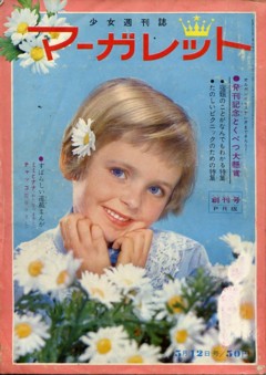 これが創刊号の表紙です。 創刊50周年ということで集英社では現在色んなイベントを企画したり、記念号を発行したりしております。その一環として本年8月頃に発行の「マーガレット」誌に創刊号からすべての表紙を収録した小冊子を付録につけるそうです。 そんなわけで本日お店に小冊子の表紙用の写真を撮りに集英社マーガレット編集部の方が来店しました。