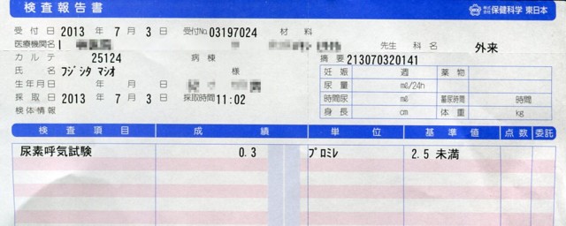 しばらくバタバタと忙しかったのだが、ようやくピロリ菌の駆除結果を聞きに医者に行けた。診察室に入った瞬間、医者からオメデトウと言われた(^^ゞ。検査報告書をそのまま貰ったのだが、単位とかがよくわからないのでグーグル先生に聞いてみた。プロミレというのはパーミルと同じ意味なので1000分の1ということらしい。2.5以下ならOKなので、0.3は文句なしにOKのようだ。てなわけで胃に関してはしばらく大丈夫そうだ(^^ゞ