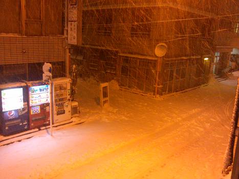 2月8日の晩に撮った店の前からの雪の様子。