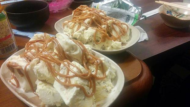 毎度おなじみの宴会用のデザート。ナッツとバナナのアイスクリーム生キャラメル添。生キャラメルは、練乳をグツグツ2時間煮て作ってみました。